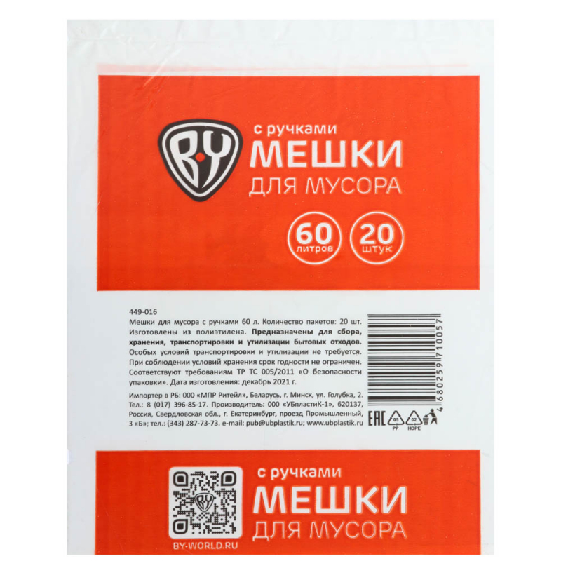 VETTA Мешки для мусора с ручками 60л, 20шт, 10 микрон