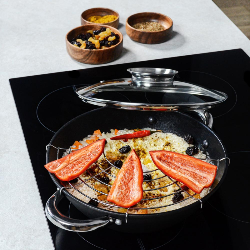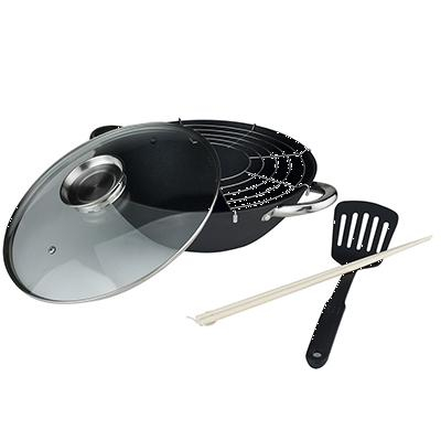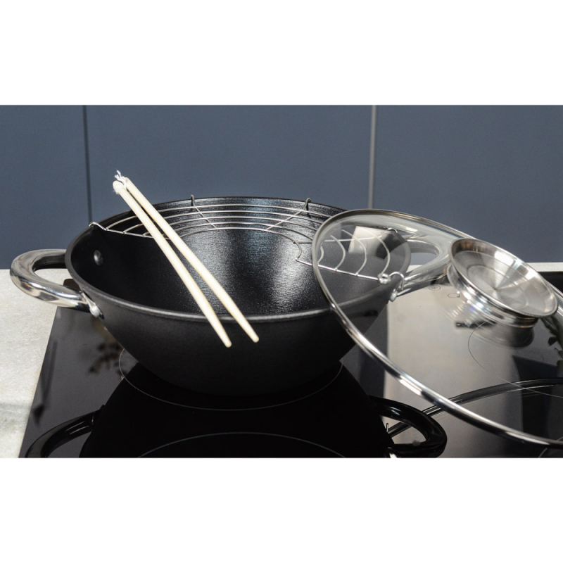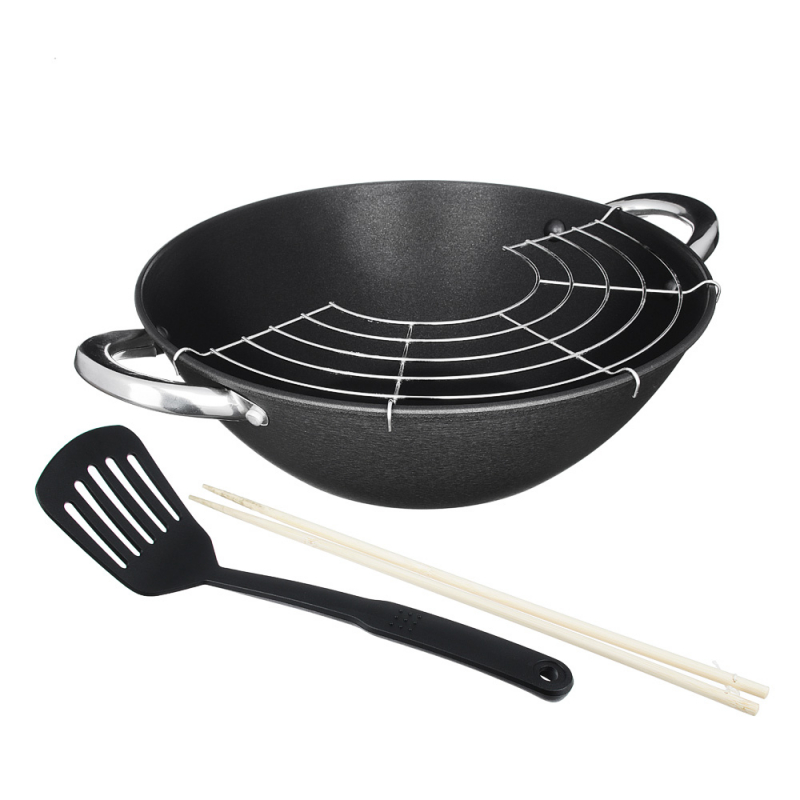 казан, стеклянная крышка, решетка, нейлоновая лопатка, бамбуковые палочки