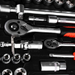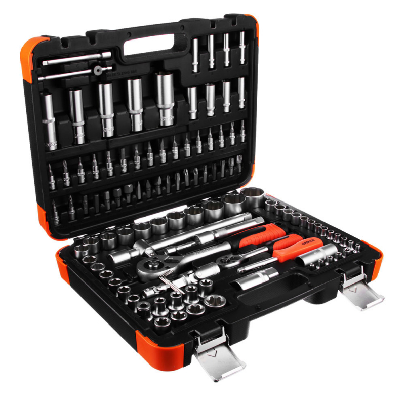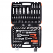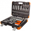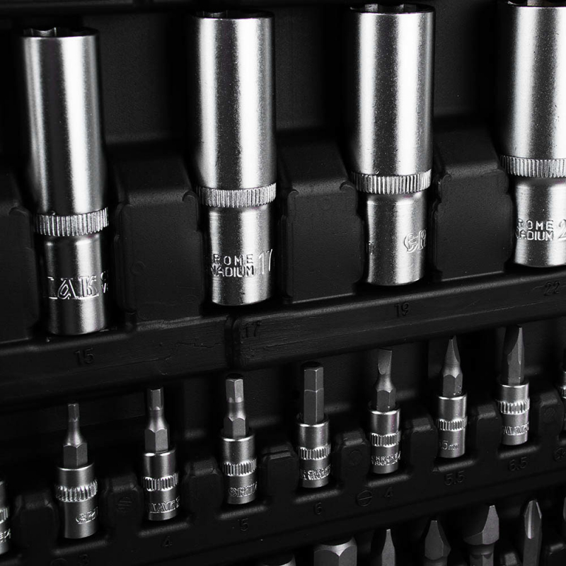 Головки торцевые 1/2": 10-11-12-13-14-15-16-17-19-21-22-24-27-30-32мм (17шт.), Головки длинные 1/2": 14-15-17-19-22мм (5шт.), Головки TORX 1/2": Е10-Е11-Е12-Е14-Е16-Е18-Е20-Е24 (8шт.), Карданный шарнир 1/2", Ключ трещоточный с быстрым сбросом 1/2", Удлинитель 1/2" 125мм, Удлинитель 1/2" 250мм, Головка свечная 1/2" 16мм, Головка свечная 1/2" 21мм, Головки торцевые 1/4": 4-4.5-5-5.5-6-7-8-9-10-11-12-13-14мм (13шт.), Головки длинные 1/4": 6-7-8-9-10-11-12-13мм (8шт.), Головки TORX 1/4": Е4-Е5-Е6-Е7-Е8 (5шт.), Карданный шарнир 1/4", Удлинитель 1/4" 50мм, Удлинитель 1/4" 100мм, Отвертка с присоединительным квадратом 1/4", Вороток Т-образный 1/4", Ключ трещоточный с быстрым сбросом 1/4", Отверточные торцевые головки 1/4" (18шт.): TORX: T8-T10-T15-T20-T25-T27-T30; PH: 1-2; PZ: 1-2 HEX: 3-4-5-6мм; Slotted: 4-5,5-6,5мм, Биты 5/16" (17шт.): TORX: T40-T45-T50-T55-T60; PH: 3-4; PZ: 3-4; Slotted: 8-10-12мм; HEX: 7-8-10-12-14мм; Slotted: 8-10-12мм, Переходник 1/2"-3/8", Битодержатель 1/2", Ключи ше