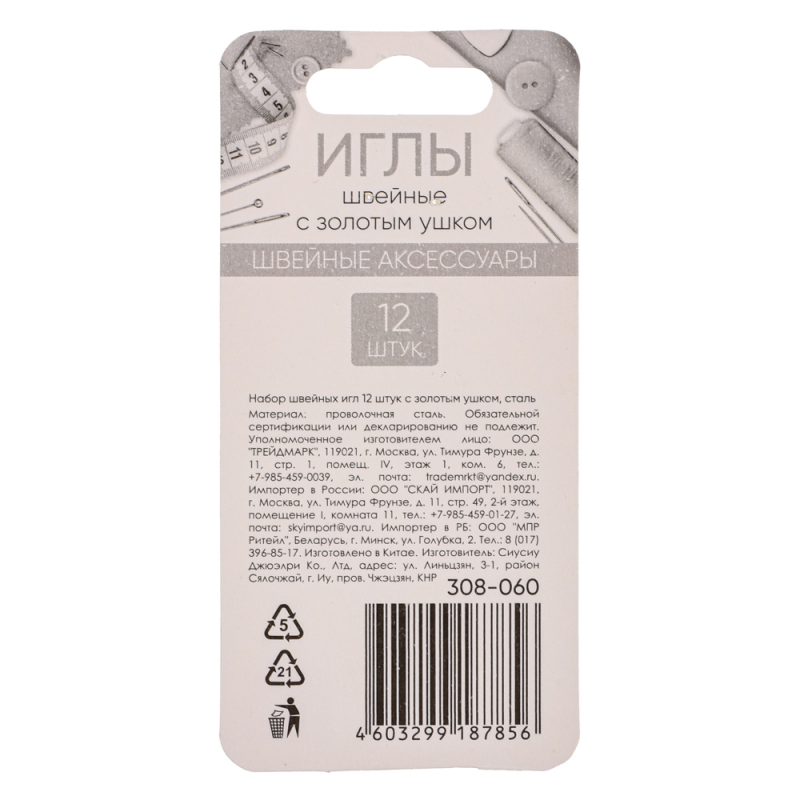VETTA Набор швейных игл 12шт с золотым ушком, сталь