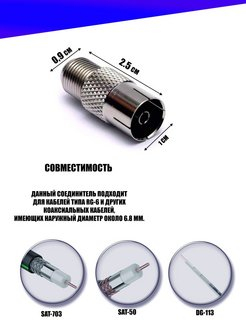 Переходник предназначен для соединения двух кабелей с волновым сопротивлением 50 или 75 Ом, имеющих на концах разные типы ТВ-разъемов. Применяется главным образом для подключения эфирного, кабельного и спутникового телевидения к телевизионному оборудованию. С одной стороны находится гнездо F-разъема, а с другой гнездо ТВ-разъема. **Особенности:** \- Изготовлен переходник из никелированного сплава первичной меди \(биметалл\)\, что гарантирует минимальный уровень потерь при прохождении сигнала и обеспечит долговечность соединения\. \- Разъем соединяет кабель методом накрутки F\-коннектора с одной стороны\, после соответствующей зачистки контактов\, и стыковки штекера ТВ с другой\, не требуя в ходе монтажа применения каких\-либо специальных инструментов\. \- Соединяет кабели с разными типами разъемов\. \- Возможность осуществлять монтаж без пайки контактов в удаленном месте \(на крыше дома или обширных складских комплексах\)\. \- Имеет высокую стойкость соединения разъем\-кабель к внешним механическим воздействиям\. \- Размер: 2\,5х1х0\,9 см Данный соединитель подходит для кабелей типа RG-6 и других коаксиальных кабелей (SAT-50, SAT-703, DG-113), имеющих наружный диаметр около 6.8 мм. Данный переходник незаменим для построения сети кабельного телевидения, различных видеосистем и подключения эфирного телевидения, обеспечивая великолепную передачу видео- и аудиосигнала с минимальным уровнем потерь. **В комплекте:**Переходник гнездо F (мама) - гнездо TV (мама) - 5 шт. **Гарантийный срок** \- 1 месяц