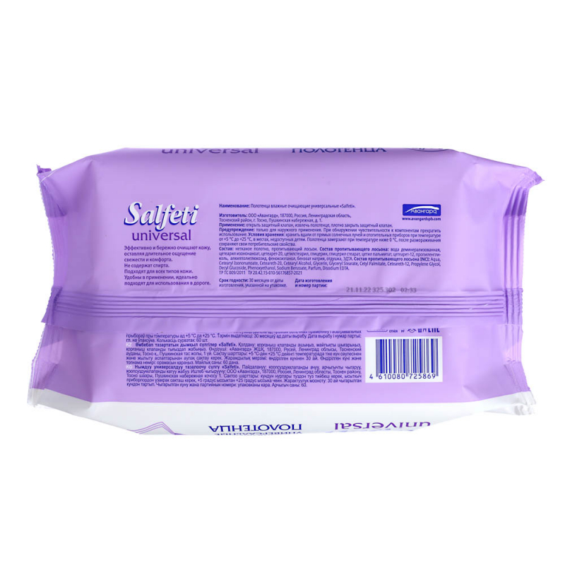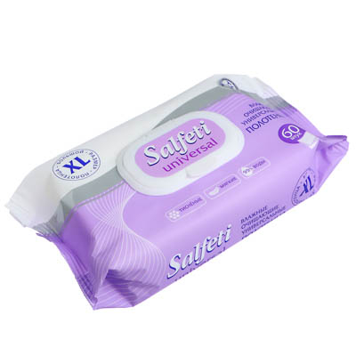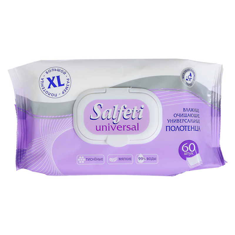 Salfeti Universal №60 XL полотенца влажные очищающие универсальные, 1 упаковка. Большие полотенца удобны в использовании и подходят для всей семьи.Вы можете их использовать в различных местах, при первой необходимости и если нет возможности провести полноценный уход.Не содержат спирта.Имеют нейтральный для кожи pH.Прошли дерматологический контроль для чувствительной кожи.