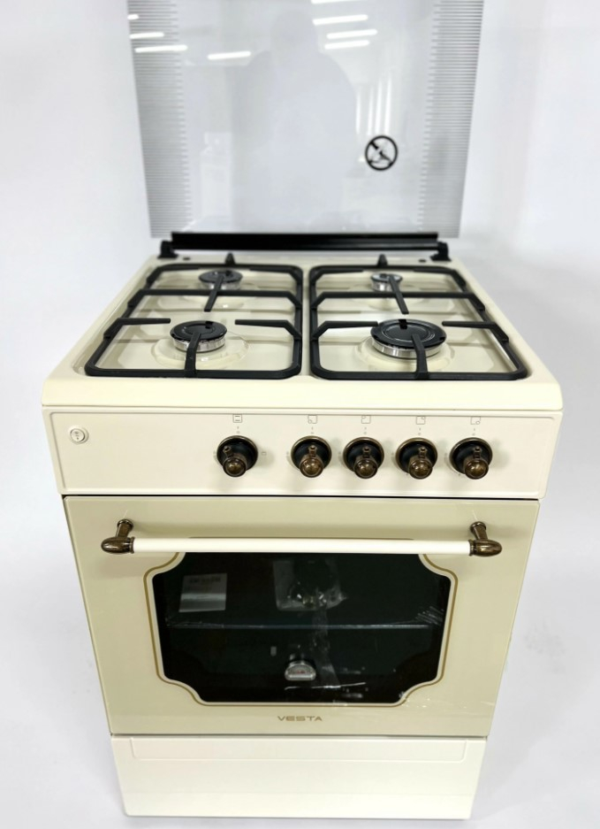 Горелки стола: Газовые – 4 шт. Мощность горелок рабочего стола: Горелка передняя левая/правая – 2,0/2,4 кВт. Горелка задняя левая/правая – 2,0/1,0 кВт. Электрический духовой шкаф. Объем духовки в литрах: 65 л. Верхний/нижний нагреватель духовки – тен. Решетка рабочего стола – сталь. Крышка рабочего стола – стекло. Термометр духовки. Кнопка электророзжига горелок стола. Электрическая подсветка духовки. Противень – 2 шт.