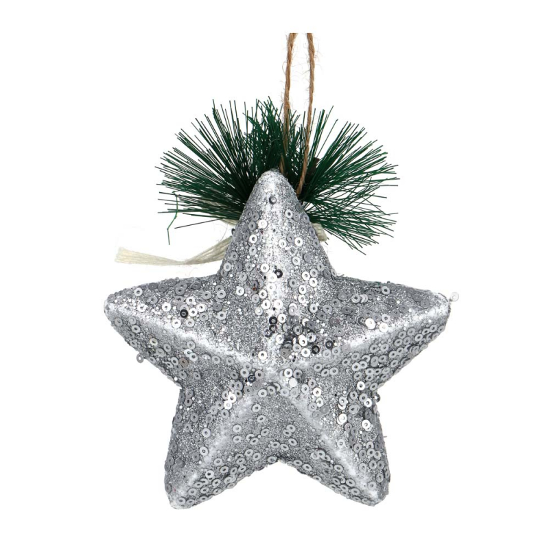 Подвеска декоративная СНОУ БУМ в виде серебристой звезды с хвойным декором – красивая и оригинальная новогодняя игрушка, которая может стать элементом праздничной дизайнерской композиции, украсит елку или пригодится для творчества. Блестящяя и яркая фигурка в пайетках и с глиттером завораживает своим видом и привлекает внимание. Размер 11х11 см.