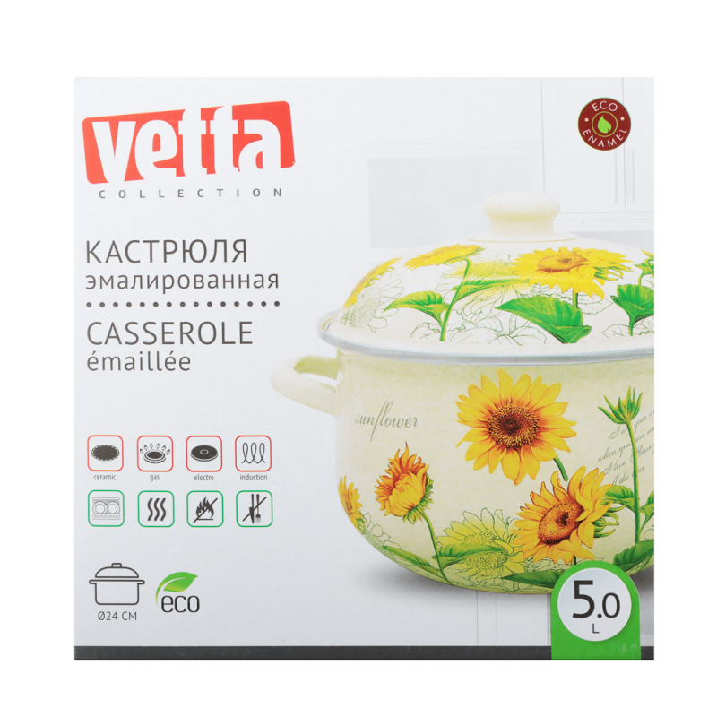 Нужна безопасная, качественная и красивая посуда для кухни? Эмалированная кастрюля Vetta «Серия 1» отвечает всем заявленным критериям. Идеально гладкая поверхность легко очищается от загрязнений, исключает размножение бактерий. В такой емкости можно хранить первые и вторые блюда. Приготовленный суп не пропитается запахом металла и не испортится.Причины купить эмалированные кастрюли Vetta:• варите на всех типах плит, включая индукцию;• объем — 5 литра, диаметр — 24 см;• можно ставить в духовой шк