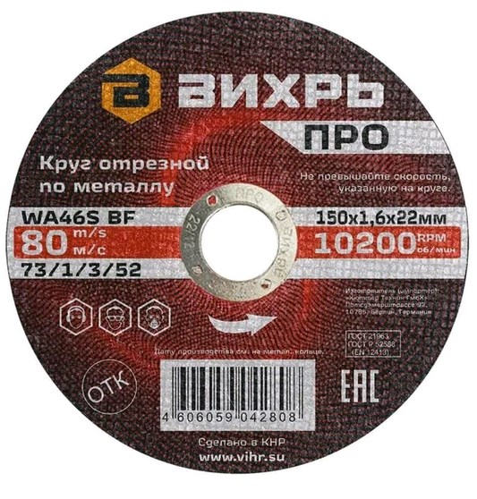 Диск отрезной по металлу ВИХРЬ ПРО 150х1,6х22 мм (выбивать по 25 шт!! цена за 1 шт!!)