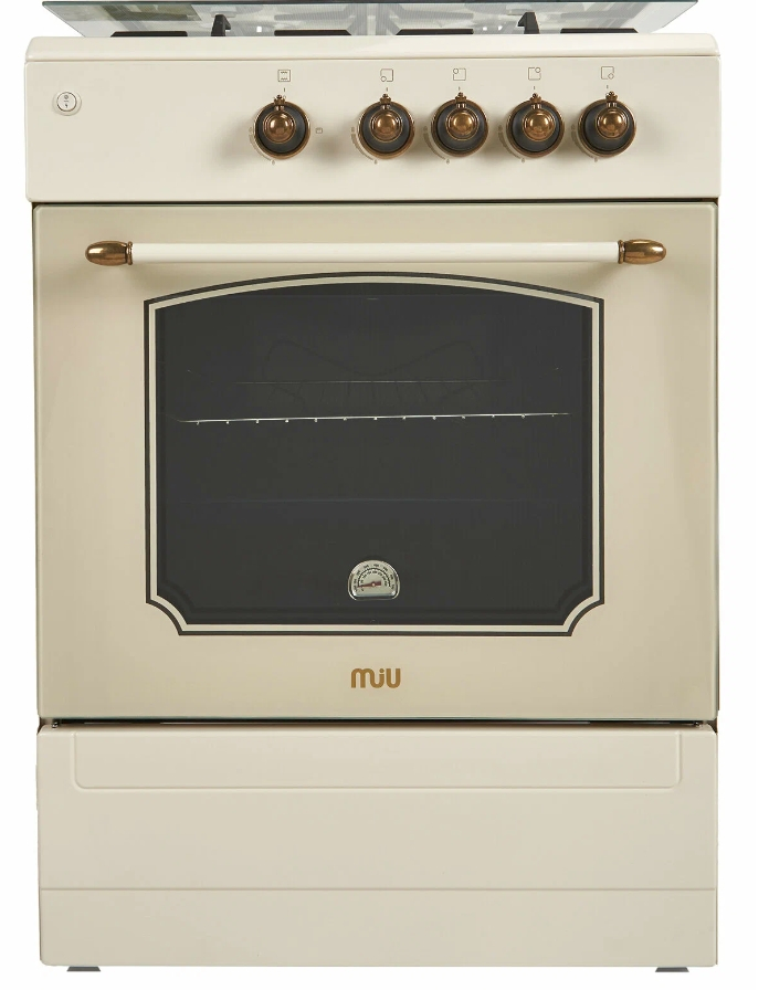 Газовая плита 60 см MIU 6017 GKRPCH Ретро бежевая Retro выполнена в изысканном стиле с бежево-сливочным покрытием и медными декоративными элементами.