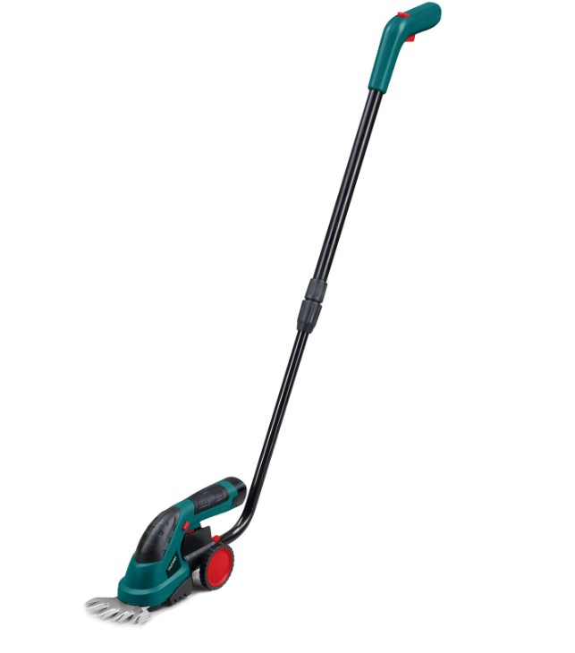 триммер, батарейный блок, зарядное устройство, насадка для стрижки кустов, насадка для стрижки травы, телескопическая ручка, колеса, руководство по эксплуатации, гарантийный талон