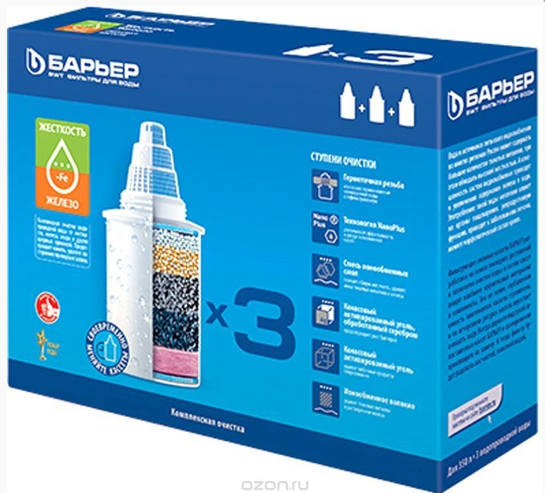 Категория: комплект картриджей Количество фильтров/картриджей: 3 Тип фильтра(ов): ионообменный (умягчение), угольный (сорбционный) Процессы: удаление хлора, удаление металлов и деманганация, удаление бактерий и вирусов (обеззараживание), удаление накипи Назначение картриджа: для фильтров-кувшинов Совместимые системы фильтрации: БАРЬЕР Аляска, БАРЬЕР Гранд, БАРЬЕР Гранд Нео, БАРЬЕР Прайм, БАРЬЕР Прайм Опти-Лайт, БАРЬЕР Сингапур Опти-Лайт, БАРЬЕР Смарт, БА Технические характеристики Ресурс фильтрующего модуля: 350 л