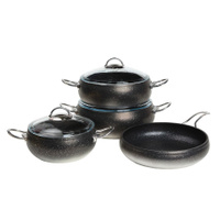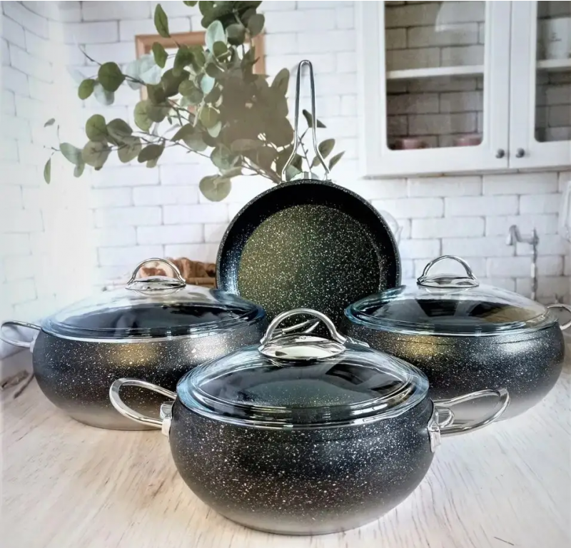 Набор посуды с антипригарным гранитным покрытием из 7 предметов (кастрюли - 2 шт., сотейник - 1 шт., сковорода - 1 шт., крышки стеклянные - 3 шт.) выполнен из легкого и прочного алюминия. Внутреннее многослойное антипригарное покрытие усилено гранитными частицами для повышения прочности и срока службы. Покрытие не содержит PFOA, APFO, C8, экологически безопасно. Уплотненное дно 6 мм предотвращает деформацию, обеспечивает быстрый, равномерный нагрев и дает возможность использовать на всех видах плит, кроме индукционных. Ненагревающиеся ручки, каждый предмет имеет отверстие для подвешивания на крючок. Изготовлен из алюминия, нержавеющий материал. Неприхотлив в уходе, можно мыть в посудомойке. Устойчив к высоким температурам, инертен к химическому воздействию. Комплектация: кастрюли с крышками - 20х9 см (2,5 л) - 1 шт., 24х10,5 см (4,5 л) - 1 шт., 26х11 см (5,7 л) 1 - шт., сковорода без крышки 26х7 см (2,8 л) - 1 шт. Производство - Турция.