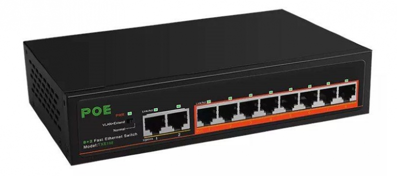 Этот коммутатор оснащен восемью портами 100 Mbps PoE, что позволяет подключать до восьми устройств, таких как IP-камеры, точки доступа Wi-Fi или другие устройства с поддержкой PoE. Он также имеет два порта 100 Mbps Uplink для подключения к другим коммутаторам или серверам.