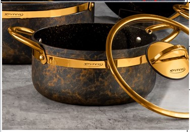 EVREN ИНДИГО КАСТРЮЛЯ 24 СМ. 3,8 Л. ТОЛЩИНА:4 MM.С ЗОЛОТОЙ РУЧКОЙ.СТЕКЛ. КРЫШКА.АНТИПРИГ.АЛЮМИНИЙ.