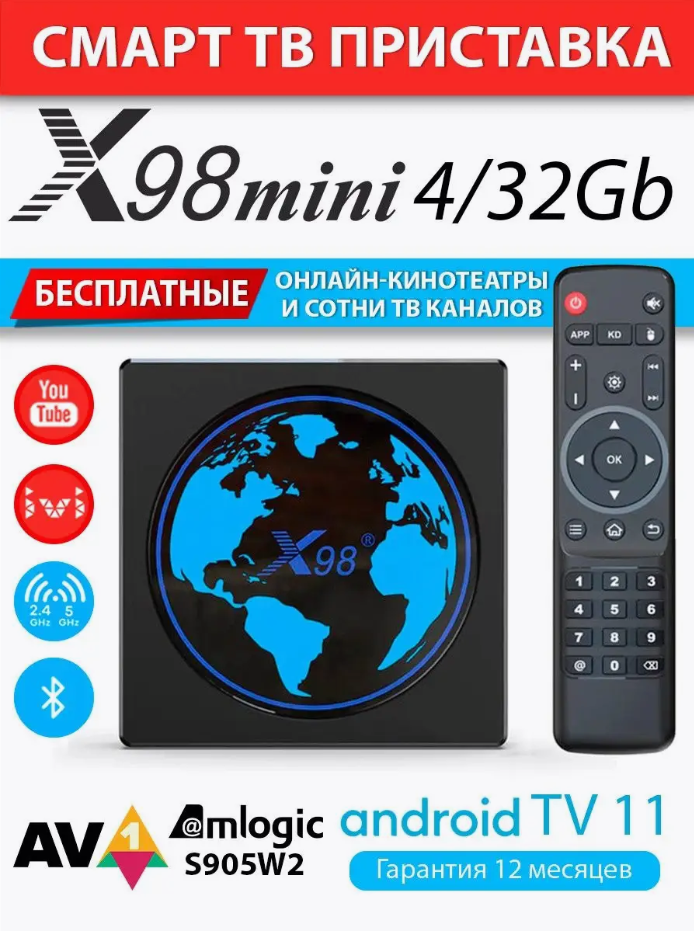 **Настроена и готова к использованию!** - В этой смарт ТВ приставке уже предустановлены YouTube, интернет-браузер, программы для бесплатного просмотра более 200 ТВ каналов, бесплатные онлайн-кинотеатры, видеоплеер и другие полезные программы! Наслаждайтесь просмотром любимого контента сразу после подключения ТВ приставки к телевизору и интернету и не тратьте время и силы на установку программ и настройку приставки. Смарт ТВ приставка X98 mini значительно расширит функционал Вашего телевизора, внося разнообразие в семейный досуг. Android ОС TV 11 делает ТВ приставку универсальным медиаплеером, вы сможете смотреть видео онлайн или оффлайн, работать в интернете через браузер, устанавливать приложения из Playmarket, пользоваться социальными сетями, играть в различные Android игры. В комплектации Вас приятно порадует инструкция на русском языке.