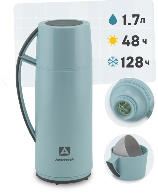 АРКТИКА Термос бытовой, вакуумный, со стеклянной колбой, 1700 мл, арт.1010-1700, цвет голубой