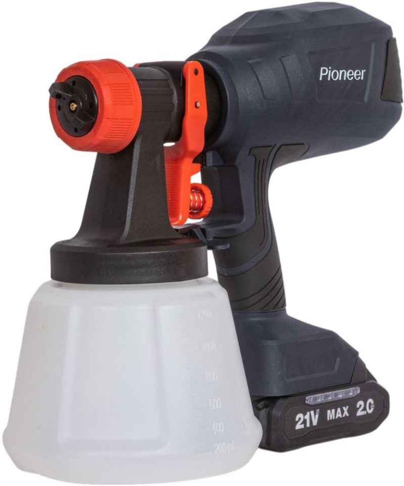 Аккумуляторный краскопульт Pioneer BSG-2020-01 с высокой скоростью потока, щеточным двигателем и регулировкой интенсивности распыления – это идеальное решение для быстрой и равномерной покраски стен, мебели, заборов, автомобилей и других поверхностей.