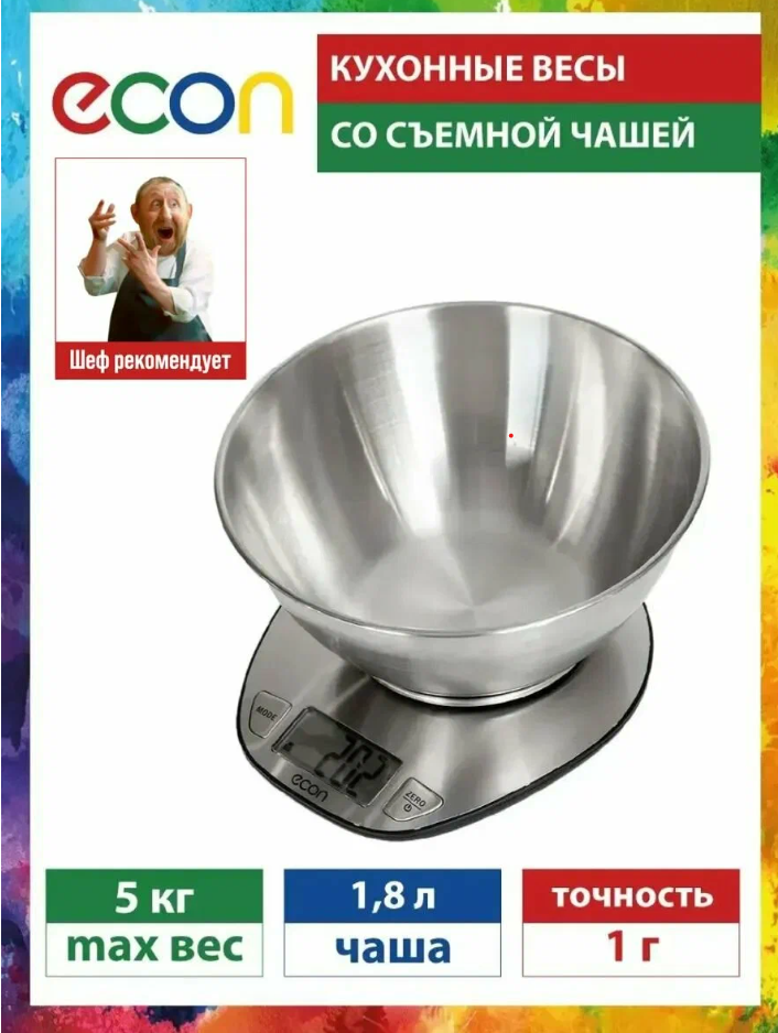 Весы кухонные, электр. ECON ECO-BS357K (чаша 1,8л сталь макс. 5 кг, шаг 1 гр)