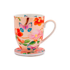Кружка 0.4л с подставкой "Камелии на розовом" в подарочной упаковке.