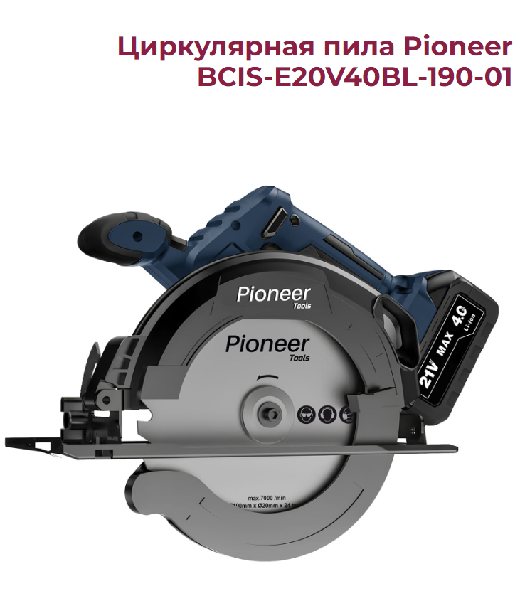 Пила дисковая аккумуляторная Pioneer BCIS-E20V40BL-190-01, диск D 190мм. акб 4000мАч. об/мин.5200