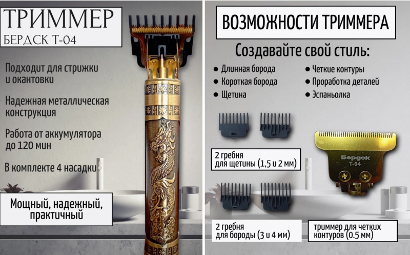 Триммер Бердск Т-04. акб работа 120 мин 4 насадки Сухое бритье Борода, Волосы, Усы
