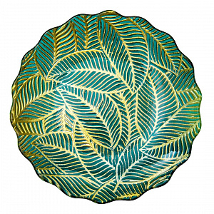 Блюдо стеклянное с волнистыми краями Листья, D305, зеленый, золотой Tin-20