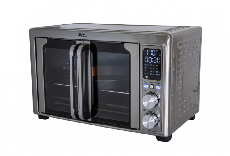 электропечь, металлическая решетка, плоский противень, ухват для противня, круглый противень для пиццы, вертел для гриля, ухват для вертела, насадка для приготовления шашлыка/кебаба, поддон для крошек, воздушная корзина, корзина для жарки, гарантийный талон, инструкция на русском языке