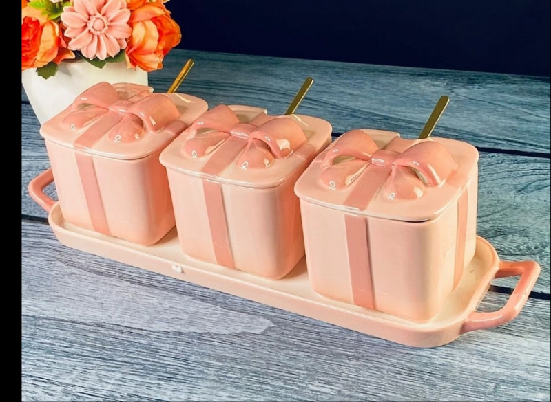 LENARDI Набор из 3 баночек 350 мл с ложками на подставке MULTICOLOR в под.уп.(х12)Фарфор