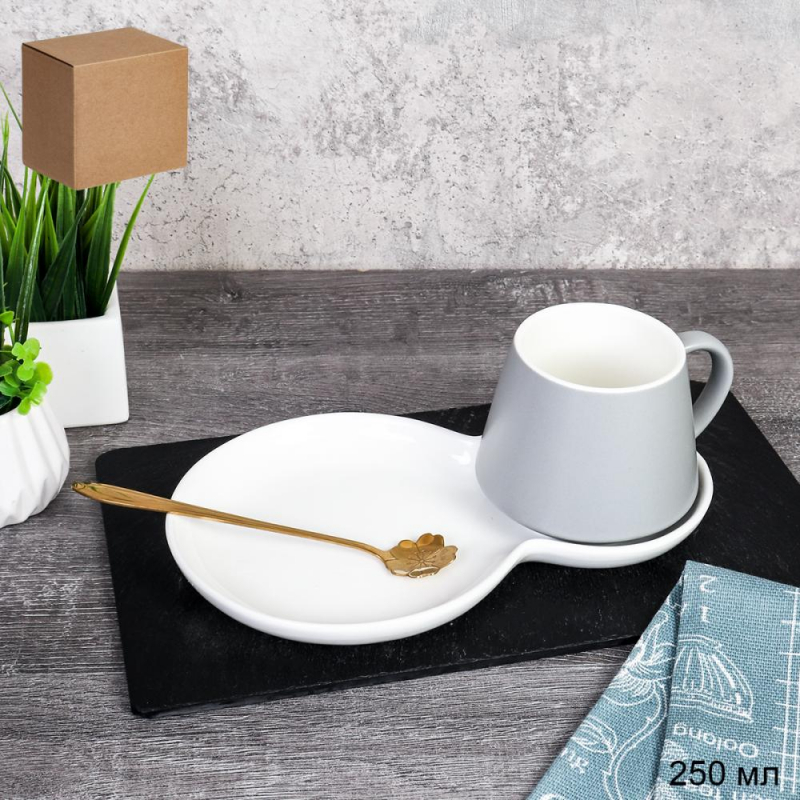 Чайная пара 3 предмета 250 мл с ложкой / FED-119 / Серая