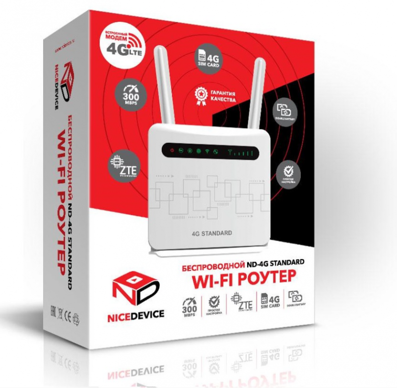 Роутер NICEDEVICE 4G STANDARD (съемн антен) Wi-fi 2.4ГГц 4G LTE800 МГц, 900 МГц, 1800 МГц, 2100 МГц,
